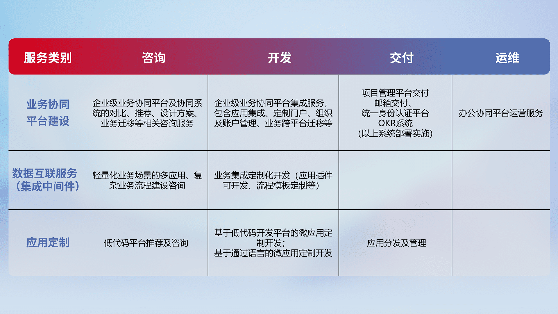 针对钉钉、、、、企微、、、IDaas等平台级产品提供产品的规划、、、、方案、、、交付、、定制化开发等服务,,,实现如统一协同办公、、智能客户服务、、、混合会议管理、、智能数据查询、、、、等业务场景,,实现数字化转型。。。